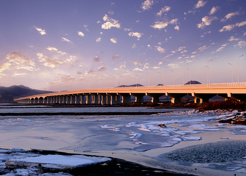大橋工程分為主橋、預(yù)制段引橋和北側(cè)現(xiàn)澆段引橋,其中主橋長500米,主跨為120米的大跨變截面預(yù)應(yīng)力混凝土連續(xù)箱梁,是當(dāng)時東北地區(qū)跨度最大的連續(xù)梁跨海橋。大橋的設(shè)計結(jié)合了使用和景觀的雙重功能,作為普灣經(jīng)濟區(qū)核心位置的地標(biāo)性景觀,獨具特色的夜景設(shè)計使其成為經(jīng)濟區(qū)一道亮麗的風(fēng)景線。